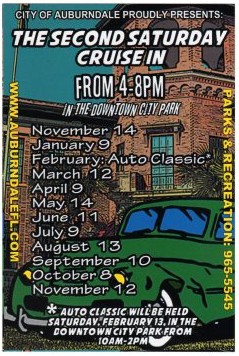 Auburndale Second Saturday Cruise In - Second Saturday of the month in the Downtown City Park, 200 E. Park St., Auburndale, FL from 4:00 PM to 8:00 PM. Music, food, door prizes, 50/50 and more. Open to all vehicles. Call Bob Caszatt @ 863-934-0223 or click on this link for more information. FREE.