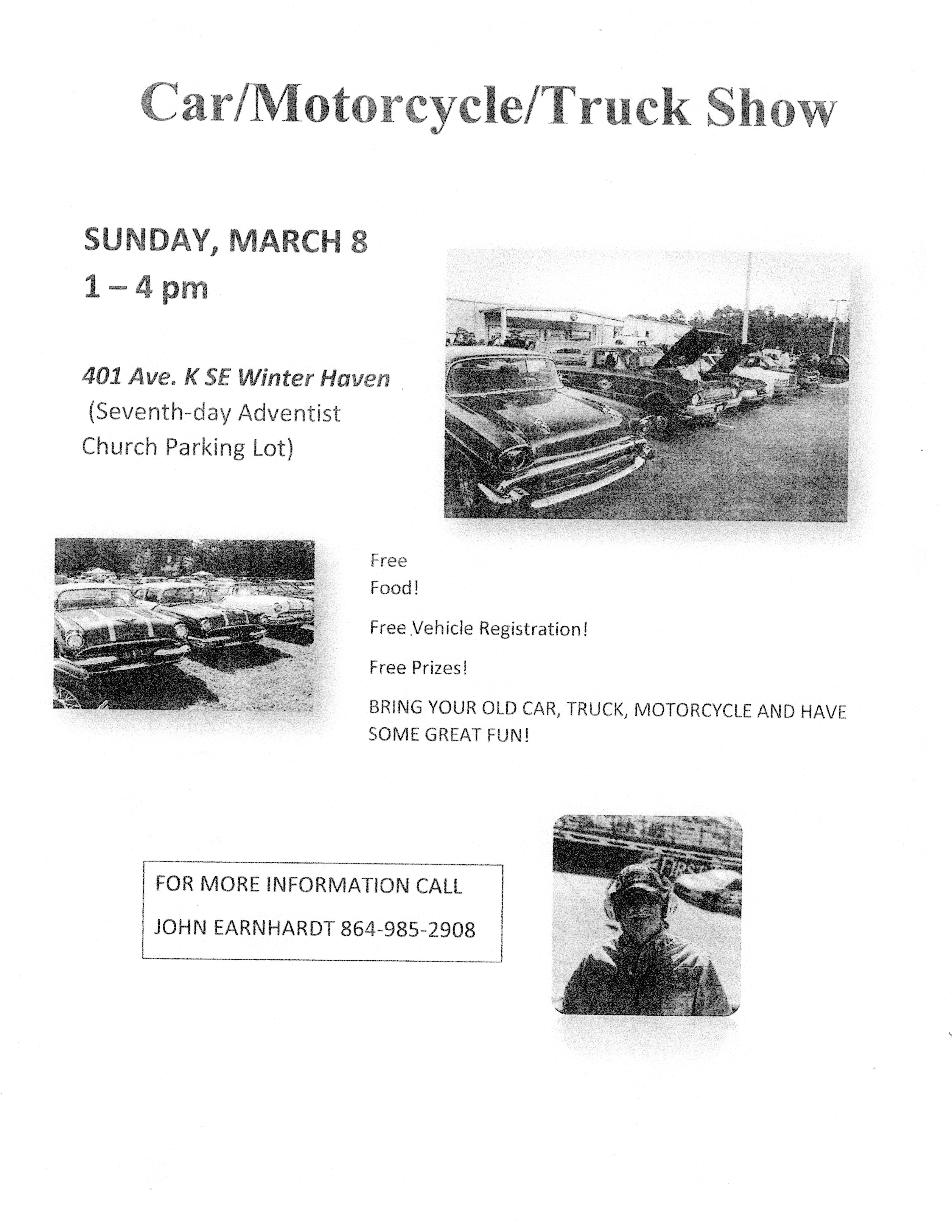 March 8th - Car/Motorcycle/Truck Show. 1:00 PM to 4:00 PM at Seventh-day Adventist Church Parking Lot, 401 Ave. K SE, Winter Haven, FL. Free registration, free food and free prizes! Bring your old car, truck motorcycle and have some fun! For more information, click here for a flyer or call John Earnhardt at 864-985-2908. FREE.